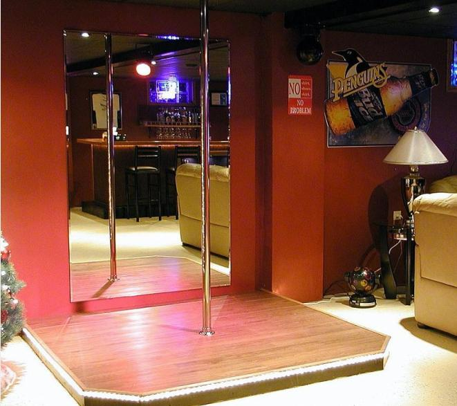 · Finally, the cou de gras, a stripper pole complete with stage andspotlight, one of the few reasons the wife will be allowed to enter